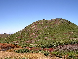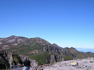 頂上から左を望む。烏帽子岳の裾に広がる紅葉が美しい |