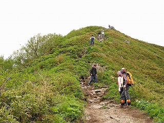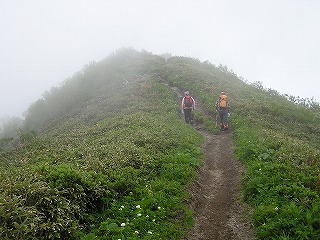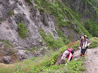 羅漢岩前の急斜面を気を付けながら降りる | 前方のオロフレ山の頂上はガスに隠れていた。 |