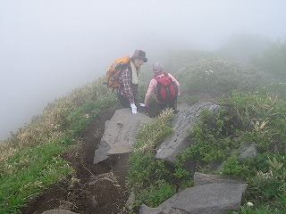 既に時刻は11時半、下山者と交互通行で | 頂上直下の岩に向かって。頂上はガスのようだ |