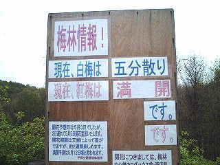 紅梅は満開状態。土日が最終花見日か? | 5/16の看板。「白梅5分散り」が印象的表現 |