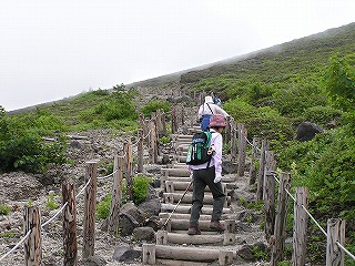 火山礫の積み重なった道には丸太で流れ止めが施してあった。勾配が緩やかな中ほどからはその必要なし。 | |