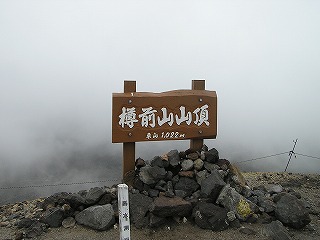 9:50外輪の縁に着くと西山と東山の分岐標識。奥にドームが | 10:00に外輪山の最高地に立つ山頂標識(1022m)。山の最高地はドームの頂上で少しずつ高くなっているようで現在1,041m。 |